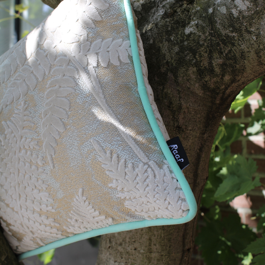 Dit sierkussen Varen 2.0 mint is van het merk Raaf. Het is gemaakt van een zware kwaliteit velours met reliëf in de vorm van bladeren van een varen. De bies is van een fel mint kleurige meubelstof. De hoes is gemaakt in Europa en de kussen-vulling is gemaakt in Nederland van een 100% katoenen tijk gevuld met 100% gerecycled dons en veren.