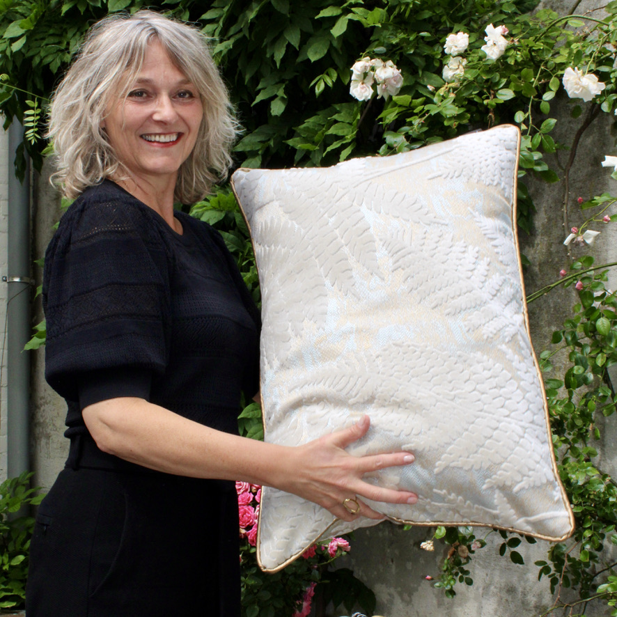 Dit sierkussen Varen snow is van het merk Raaf. Het is gemaakt van een zware kwaliteit velours met reliëf in blader motief. Het heeft een koperkleurige leder-look bies. De hoes is in Europa gemaakt. De kussen-vulling is gemaakt in Nederland van een 100% biologisch katoenen tijk gevuld met 100% gerecycled dons en veren.